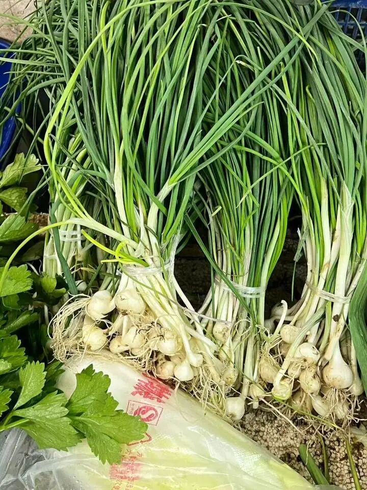 在近江三桥农贸市场附近,有一家专门卖德清蔬菜的摊位,每年春天都会有胡葱的身影出现,价格5-6元一把。