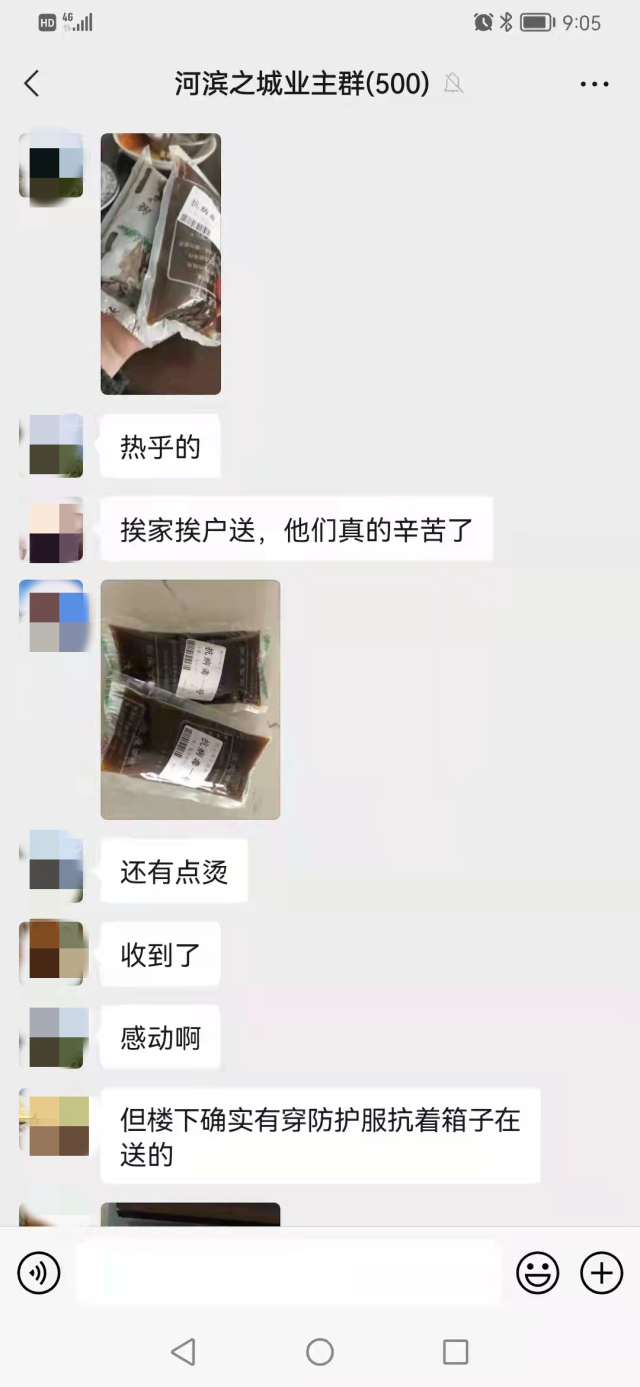 “挨家挨户送,他们真的辛苦了”“一看就是昨晚没有休息好,给她个小推车吧”“和他们比起来,我们隔离在家不算什么,大家尽量少添点麻烦”今天一早,河滨之城业主群内,业主们开始“刷屏”。